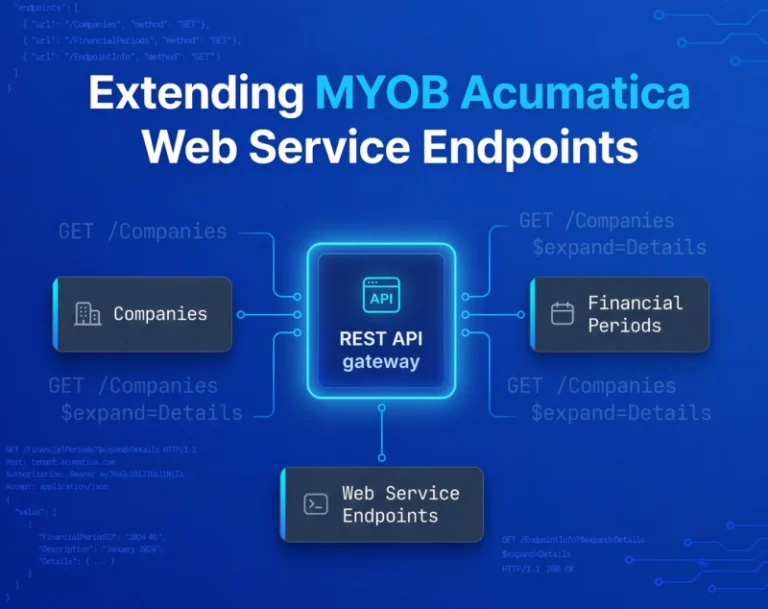 MYOB Advanced: Expose Custom Web Service Endpoints Chintan Prajapati April 23, 2026 5 min read MYOB Acumatica API Guide: Custom Endpoints & Financial Period IntegrationMYOB Acumatica does not expose Companies and Financial Period data by default.You must extend Web Service Endpoints to access this data via API.In this guide, we show how to create custom endpoints and expose Financial Period data step by step.In MYOB Acumatica API (formerly MYOB Advanced Business), certain data structures are not available through the standard REST API.When the platform does not expose specific screens or objects as REST entities, you must extend the Web Service Endpoint manually to make them accessible.How to Add Custom Companies Endpoint in MYOB AcumaticaTo expose Company data through the API, follow these steps on the Web Service Endpoints screen: Navigate to the Web Service Endpoints (SM207060) screen in MYOB Acumatica. Click the EXTEND ENDPOINT button and provide an Endpoint name and version. On the tree view on the left side, select the topmost ENDPOINT node. Click the INSERT button to add a new entity. Fill in the Object Name and set the Screen Name to CS101500. Select the new Companies entity, go to the FIELDS tab, and click POPULATE to auto-fill the available fields. Save the endpoint configuration.Test your endpoint. Use the following API call to verify the Companies entity is working: Method: GET {{baseURL}}/{{endpoint}}/CompaniesWhen Should You Use Custom Endpoints in MYOB Acumatica?Custom endpoints in MYOB Acumatica become essential when the default API structure doesn’t fully support your business workflows or integration requirements.While standard endpoints work well for common use cases, there are specific scenarios where custom endpoints offer much better control and flexibility.When Required Data Is Not Available in Default APIThe default API endpoints may not expose all fields, relationships, or business logic required for your operations.This is especially common when: You need access to custom fields or DAC extensions Data is spread across multiple entities and requires consolidation Certain computed or conditional data is not directly accessibleCustom endpoints allow you to extend and expose exactly the data you need, without relying on workarounds or multiple API calls.When Building Custom IntegrationsIf you’re integrating MYOB Acumatica with external systems such as CRMs, SaaS platforms, or internal tools, default endpoints may not correspond with your data structure or workflow.In such cases, custom endpoints help you: Create tailored data models for smoother integration Reduce API complexity by combining multiple operations into a single endpoint Preserve consistency between systems without heavy transformation logicThis becomes especially useful when building scalable integrations that need to handle growing data volumes and business complexity.When Handling Financial Period WorkflowsFinancial processes often involve strict rules around periods, validations, and approvals.Default APIs may not fully support these workflows, particularly when dealing with: Period-specific transactions Closing and reopening financial periods Validation rules tied to accounting logicCustom endpoints enable you to embed business rules directly into the API layer, making sure that financial data is processed accurately and in compliance with your internal controls.How to Add Financial Period Entity in MYOB Acumatica APIThe Financial Period data is not included in the standard REST API.This means the out-of-the-box endpoint does not expose Financial Period details, and you cannot retrieve or update periods via the default entity endpoints.To make Financial Period information accessible, you must extend a Web Service Endpoint and add Financial Period as a custom entity using the same process described above for the Companies endpoint.API Call: Once added, retrieve financial periods using: Method: GET {{baseURL}}/{{endpoint}}/FinancialPeriod?$expand=DetailsWhy Financial Period Must Be Added as a Custom EntityFinancial Period screens are not exposed in the default REST endpoint. Because of this: Financial Periods cannot be retrieved or filtered through the standard API The entity does not exist under any default endpoint. Integration tools cannot access period configurations unless you extend the endpoint manually.This is why adding a Financial Period through a custom endpoint is required for any integration that needs period data.Default APICustom EndpointLimited dataFull accessNo Financial PeriodSupports Financial PeriodNo customizationFully customizableNeed help building MYOB Acumatica integrations?Talk to our MYOB Acumatica API expertsCentralised Period Management in MYOB Acumatica (API Behavior Explained)The Financial Period API behavior depends on whether Centralised Period Management is enabled or disabled in your MYOB Acumatica instance.When Centralised Period Management Is EnabledSince Centralised Period Management is enabled, all companies share the same Financial Period configuration. Because the periods are global: Financial Periods cannot be filtered by Company ID. Period setup is done on the Master Financial Calendar (GL201000) screen. Company-specific changes are not allowed.When Centralised Period Management Is DisabledWhen this setting is disabled: Each company maintains its own Financial Periods. Configuration is done on the Company Financial Calendar (GL201100) screen. API updates can include the Company IDImportant: The Financial Period API can only be used for company-specific operations when Centralised Period Management is disabled.Example: Updating Company-Specific Financial Period(Only when Centralised Period Management = OFF)Method: PUT {{baseURL}}/{{endpoint}}/CompanyFinancialPeriod?$expand=DetailsParameterValueCompanyRBYTEHQFinancialYear2018ConclusionBy adding Financial Period and Company Financial Period as custom endpoints, you can access data that is not available in MY